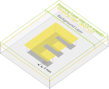 Spot UV is not suited to alignment with fine detail, such as small type, or shapes with thin lines.