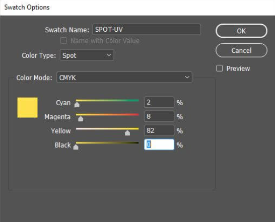 Yellow at 82%, and Black at 0%. - Press OK and now you have created your Spot UV swatch.